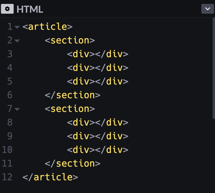 article>section*2>div*3 tab로 하나의 article안에 두개의 section으로 나눈후 div를 각각 세개씩 만들어준다.