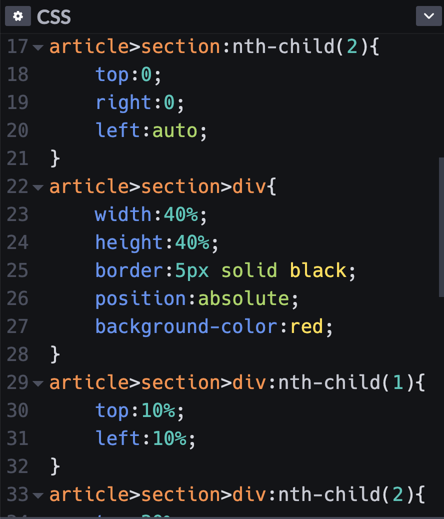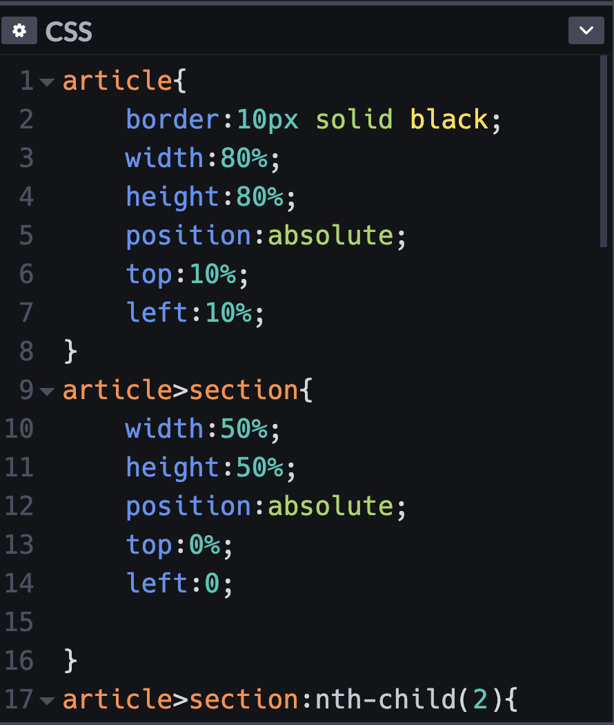3. article안의 section의 높이와 넓이를 50%, top, left는 0으로 위치지정해준다.
