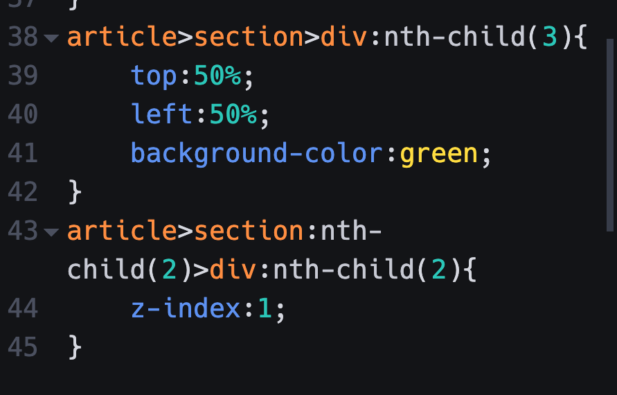 7. article>section:nth-child(2)>div:nth-child(2)로 article안의 두번째section의 두번째 div에 z-index를 사용하여 세번째div보다 앞으로 나오도록 지정해준다. z-index의 숫자가 높을수록 더 앞에 나온다.